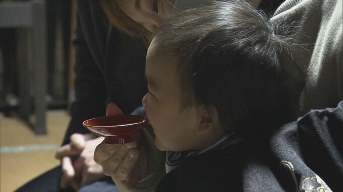 湊家当主と杯を交わし親子の契りを結ぶと、水難事故に遭わないと言われていて、晴れ着姿の赤ちゃんを連れた親子が、14代当主の湊浩章さん(63)と杯を交わしました。