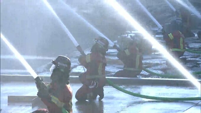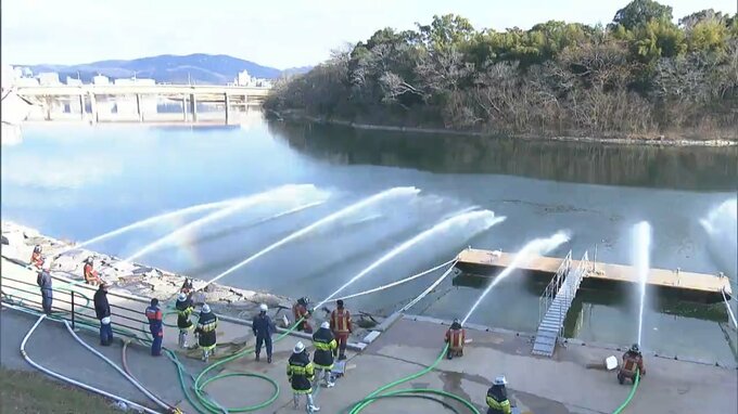 年頭の岡山市消防出初式(12日)に合わせ、岡山市北区で一斉放水が行われました。