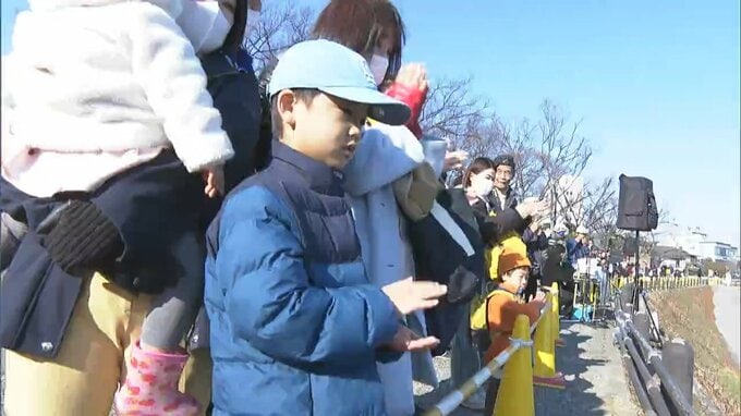 石山公園そばの河川敷で勢いよく放水が始まると、訪れた市民からは歓声が上がりました。