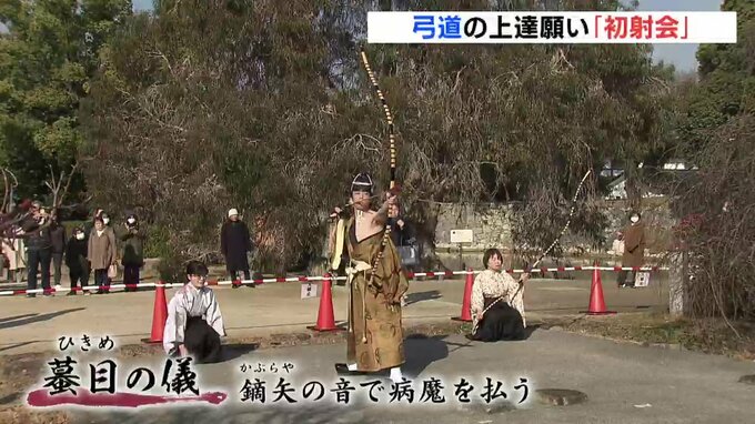 弓道の上達を願う新春恒例の「初射会」が広島城で開かれました。広島城二の丸で開かれた「初射会」でははじめに鏑矢(かぶらや)と言われる矢が発する音で、病魔を払う「蟇目(ひきめ)の儀」という儀式が行われました。