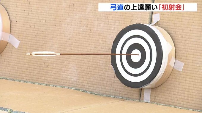 「初射会」は広島市弓道連盟が毎年この時期に開いているもので、日頃から弓道に励んでいる約50人が集まりました。参加者たちは災いを退け、幸せを願う「祝射(しゅくしゃ)」で28メートル先にある直径36センチの的に向けて次々に矢を放ちました。