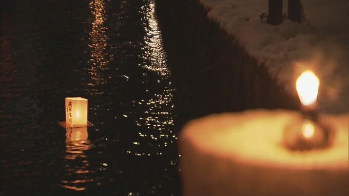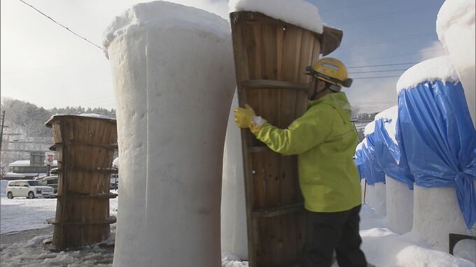 三寺まいりの夜には街に雪像ろうそくが灯り、13日の作業では、ろうそくをかたどった木枠に雪を詰め込み、水と塩を入れて固めて仕上げていきました。高さ2メートル、直径1メートルの雪像ろうそくは30本作られ、1月15日の三寺まいりで街並みに灯されます。