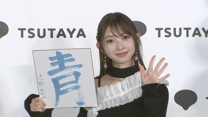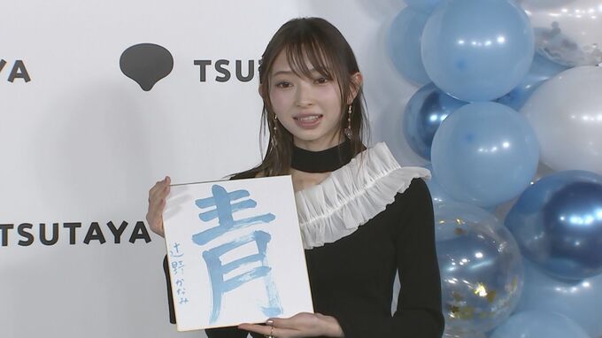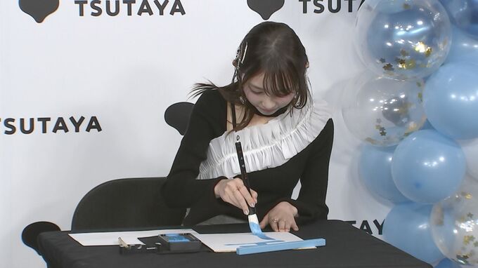 さらに、新年ということで、メンバーカラーである青色の墨を使って書初めで「写真集の最上級の推しポイント」を書くことになると、達筆文字で「青」と書き、“メンバーカラーの青を衣装だけではなく、空や海、プールや部屋の絨毯にもこだわって青をちりばめた”と語りました。