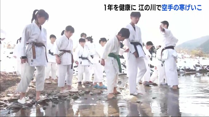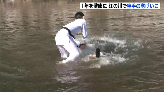 稽古の時間の気温はマイナス1℃で、水温は4℃…。厳しい冷え込みの中、参加者は寒さに耐えながら、「突き」などの型を繰り返しました。