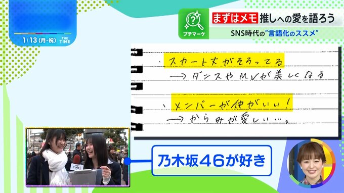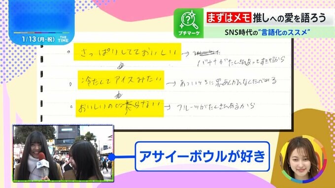 なんと、スラスラと推しの魅力が出てきました。これには本人たちも「メモを取ると喋りやすくなる」とビックリ。