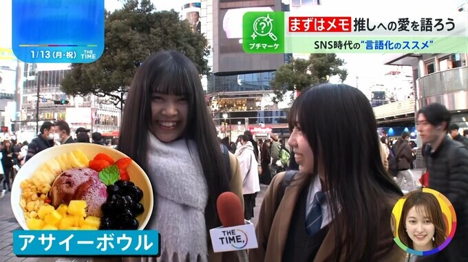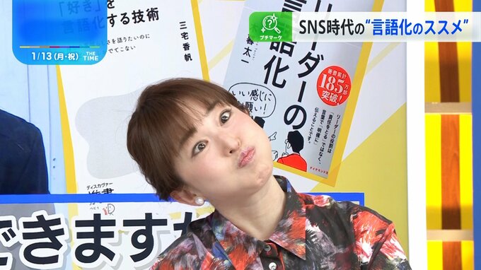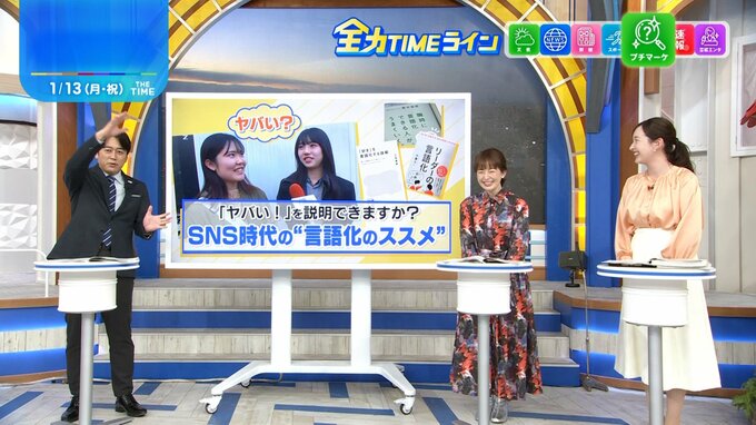 宇賀神メグアナから、どういう時に“エモい”を使うのか聞かれると、余裕の表情で「“ヤバい”でまかないきれない感情の時は“エモい”ですよ。それ以外は大体“ヤバい”で」と答えたが、宇賀神アナとTHE TIME,1月レギュラーでフリーアナウンサーの松丸友紀さんは「雑っ!」と大笑い。