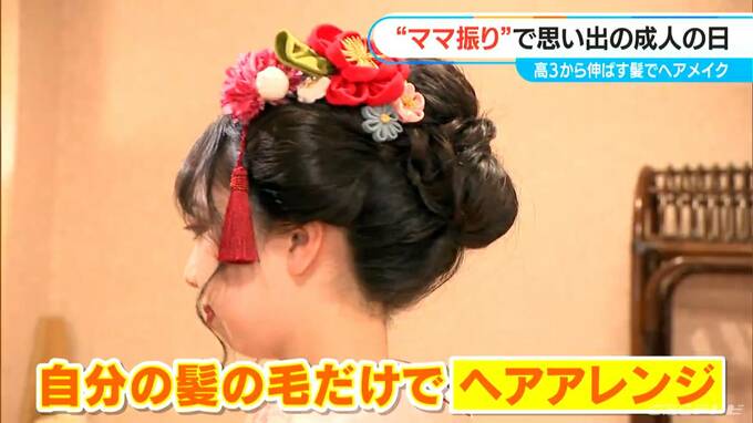 自分の髪の毛だけでヘアアレンジです。ヘアピースなど一切使いません。母の振り袖にあうアレンジにこだわったということです。
