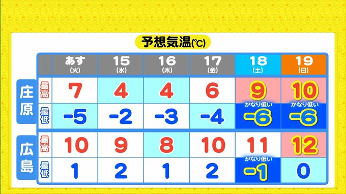 あさってにかけて気圧の谷が通過しすっきりしない天気になる予想です。あさっては上空にあすより強い寒気が入るため、北部では雪が降るところもあるでしょう。その後金曜日にかけて冬型の気圧配置で雲が広がりやすいでしょう。今週末は冬型が緩み、日中の気温は各地で平年よりも高くなり、北部でも10℃近くの予想です。ただ、朝晩の冷え込みがかなり厳しくなるので、路面や水道管の凍結に十分ご注意ください。今週は先週よりも寒さが緩みますが、引き続きあたたかくしてお過ごしください。