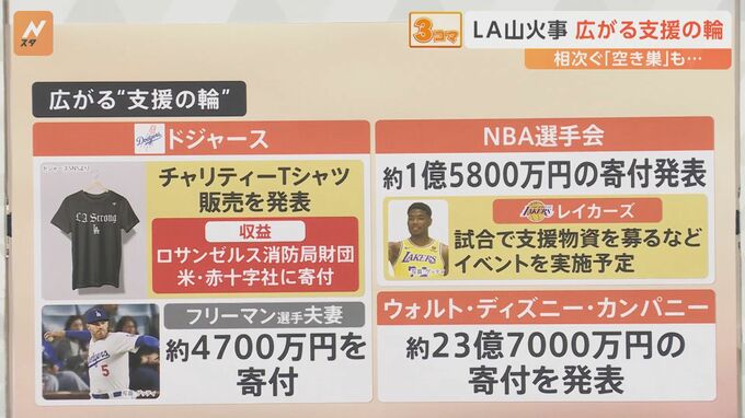 約1億5800万円の寄付を発表。八村塁選手が所属するレイカーズは試合で支援物資を募るなどイベントの実施を予定。
