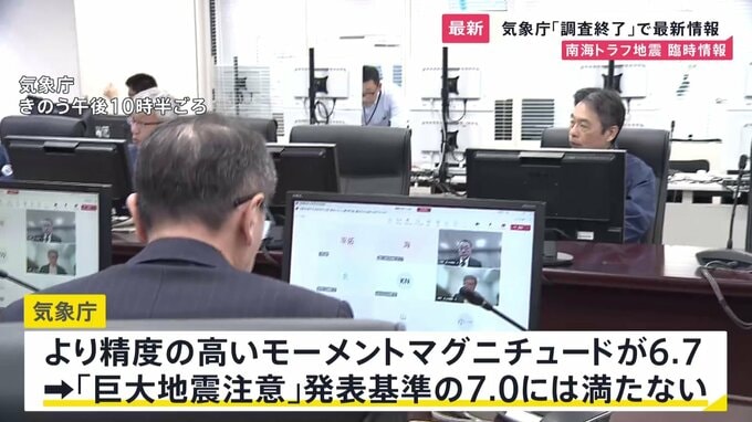 気象庁前から最新情報を伝えてもらいます。気象庁では、さきほど午前0時15分から、「評価検討会」の平田直会長らが会見を行っています。気象庁は、きのう午後9時19分ごろに日向灘で発生した地震と南海トラフ巨大地…