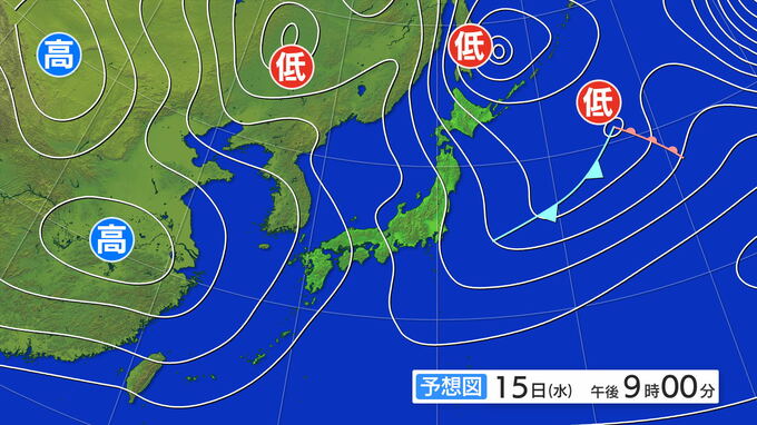 15日(水)の上空約1500メートルは東北で-15度以下の見込み 再び冬型強まり週の後半は日本海側で雪の降り方強まるところも 雪と風シミュレーション 北陸放送 2025年1月14日(火) 10:11 国内 15日(水)以降、日本の上空には強い寒気が流れ込む見込みです。冬型の気圧配置になり、特に北陸や東北の日本海側では雪の降り方が強まるところもありそうです。また16日(木)にかけては北日本の日本海を通る低気圧の影響で東北の日本海側では大雪のおそれがあります。 15日午後9時の予想天気図です。西高東低の冬型の気圧配置になりそうです。 15日(水)午後9時の予想天気図 日本海側では北よりの風が強まる見込みです。