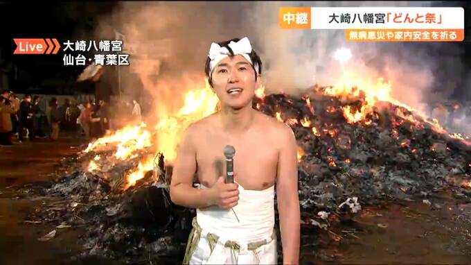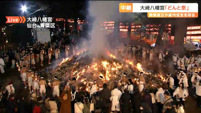 14日、宮城県内各地では小正月の伝統行事、「どんと祭」が開かれています。仙台市の大崎八幡宮にも中継が出ています。