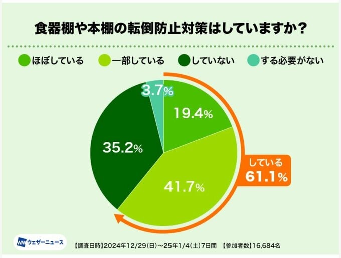 このほか、食器棚や本棚の転倒防止対策を実施している人の割合は、61.1%であることがわかりました。