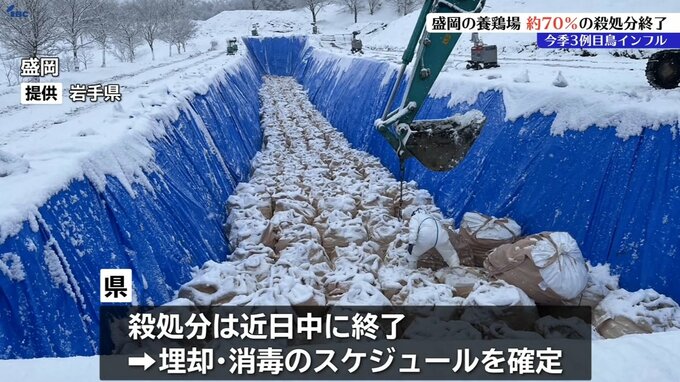 岩手県内で今シーズン3例目となる高病原性鳥インフルエンザが確認された盛岡市の養鶏場の防疫措置は、14日午前9時時点でおよそ70%にあたる28万羽あまりの殺処分が終了しました。