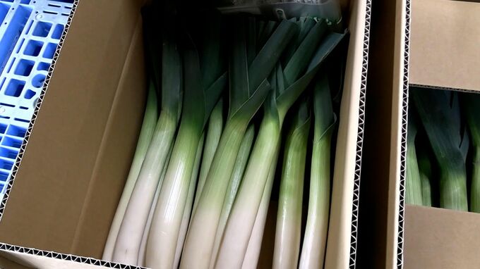 岡山県矢掛町の選果場で、きょうから本格的に出荷作業が始まったのは、西洋ネギの一種、「リーキ」です。くっきりと見える切り口の輪をたくさんの「まる」に見立てて、JA晴れの国岡山が「満点リーキ」と名づけ、売り出しているものです。