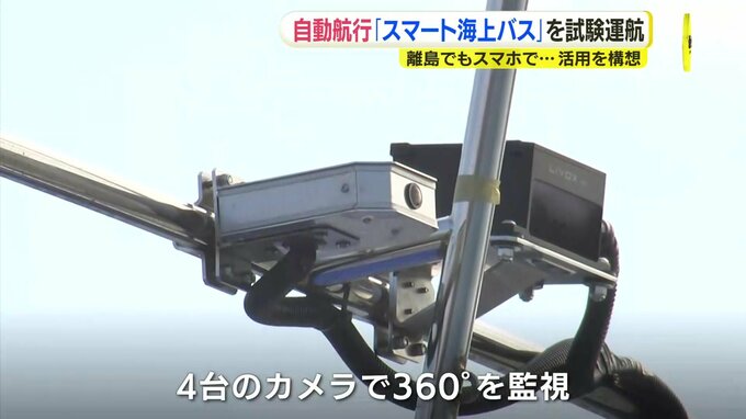使用するのは、民間の船に自動航行システムを搭載した「スマート海上バスゆき姫」です。4台のカメラで周囲360度を監視し障害物や他船を回避しながら、目的地まで自動航行します。