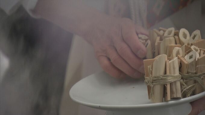 おかゆで今年の出来事を占う管粥神事が、岐阜県高山市の神社で行われました。この管粥神事は高山市丹生川町の伊太祁曽神社に600年以上前から伝わる神事です。5センチほどの長さの麻の茎に農作物や景気など占う事柄…