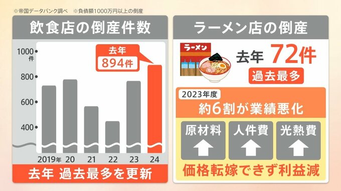 中でもラーメン店の倒産が増えていて、2024年は72件と過去最多でした。2023年度には、ラーメン店の約6割が業績が悪化したというデータもあります。