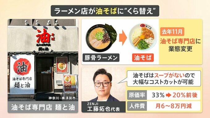 「油そば専門店 麺と油」を運営している「ZENJI」の工藤拓也代表は、「油そばはスープがないので、大幅なコストカットが可能」としていて、▼原価率も33%から20%前後に、▼人件費も月6〜8万円減ったということです。
