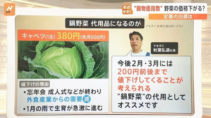 秋葉社長は「今後2月・3月には200円前後まで値下げしてくることが考えられる。“鍋野菜”の代用としてオススメです」としています。