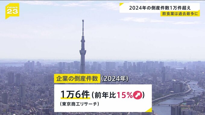 民間の信用調査会社「東京商工リサーチ」によりますと、2024年の倒産件数は、前の年から15%増えた1万6件でした。3年連続の増加となっていて、1万件を超すのは2013年以来、11年ぶりです。なかでも目立ったのが飲食…