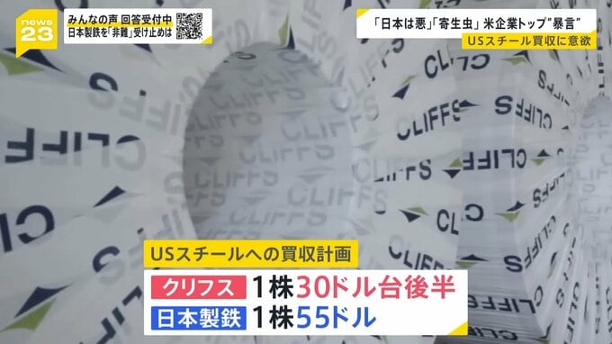 アメリカメディアによると、クリフス社は別の鉄鋼メーカーと協力して、再びUSスチールを買収する計画があるということです。ただ、クリフス社はUSスチール株を1株あたり30ドル台後半で買い取る計画だとされていて、日本製鉄による買収計画を大幅に下回る見通しです。