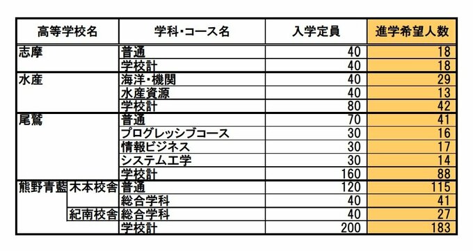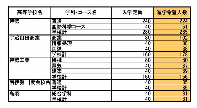 三重県立高校入試2025【進学希望状況・倍率】桑名「理数」2.60倍、松阪「理数」2.33倍、四日市農芸「農業科学」2.03倍 全日制・定時制・通信制