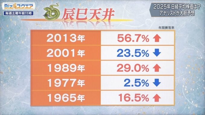 井出氏の相場の格言は「辰巳天井」となっている。辰年の2024年は見事に株価が天井を突き抜けた歴史的な年だった。そして巳年の2025年も大きく期待できそうな年となっている。
