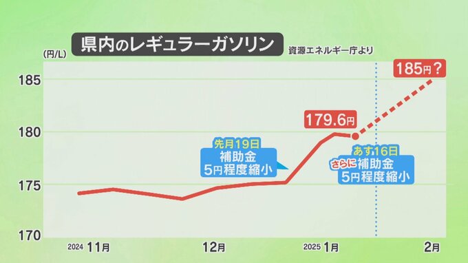 山梨県内のレギュラーガソリンの価格は1リットル179.6円で、6週ぶりに値下がりしましたが、16日からの補助金の縮小で今後185円程度の歴史的水準に値上がりする見込みで、ドライバーから諦めの声が聞こえてきます。