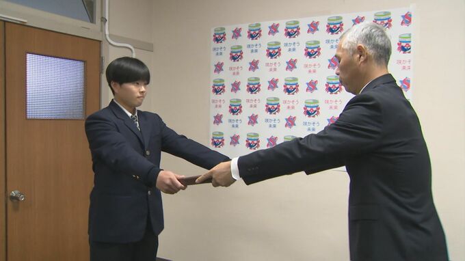 この日、学校の応接室で行われた表彰伝達式で、海洋科2年の硬式野球部主将・河本蓮友さん(17)が、鳥取県高野連の田辺洋範副会長から、日本高野連からの表彰状と記念品を受け取りました。
