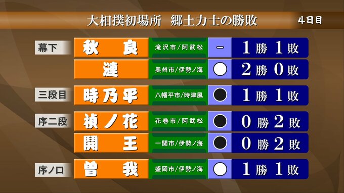 大相撲初場所4日目、郷土力士の取り組みの結果です。