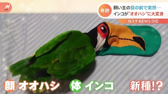 インコが突然の“変身”。靴下にジャストフィットしたインコの奇跡の瞬間を、飼い主のカメラがとらえました。シロハラインコのまりもくん(4)。靴下やパーカーのフードなど、とにかく狭いところに入るのが大好き…