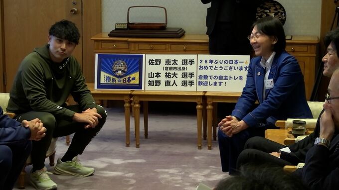 後輩の選手らとともに倉敷市役所を訪れたのは、横浜DeNAベイスターズの佐野恵太選手です。昨シーズンは日本一となり、生まれ故郷に恩返ししたいと、きのう(14日)から倉敷市営球場で後輩とともに自主トレを行っています。