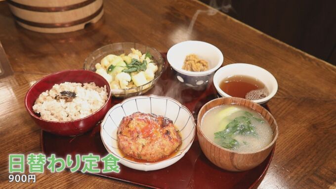 メニューは「900円の日替り定食」1種類のみ。この日は「グリルハンバーグの自家製トマトソース煮込み」。野菜炒めと炊き込みご飯はなんと食べ放題。さらに、お味噌汁がついたバランスメニューの「日替わり定食」は900円と超お得。店を1人で切り盛りする店主から定食が無料になるという、とっておき情報が!