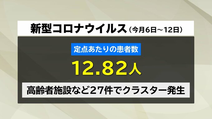 また、新型コロナウイルスの患者数も12.82人と依然高い状態が続いていて、高齢者施設などでのクラスターも27件発生しています。