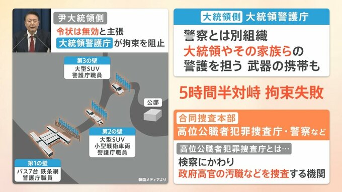 大統領側の「大統領警護庁」は、警察とは別の組織で、大統領やその家族らの警護を担い、武器も携帯しているといいます。1月3日には、大統領警護庁がバスや車両などでバリケードを作ったため、うまくいきませんでした。