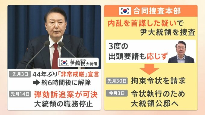 韓国では合同捜査本部が設けられ、内乱を首謀した疑いで尹大統領を捜査し、年末にかけて3度の出頭要請をしましたが尹大統領は応じませんでした。