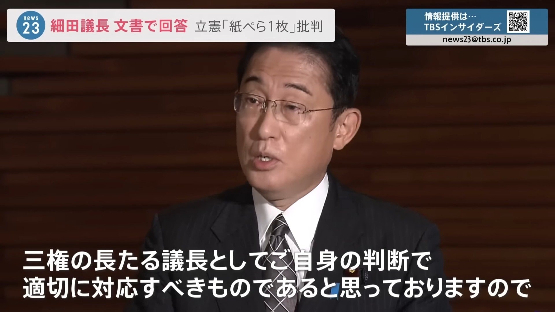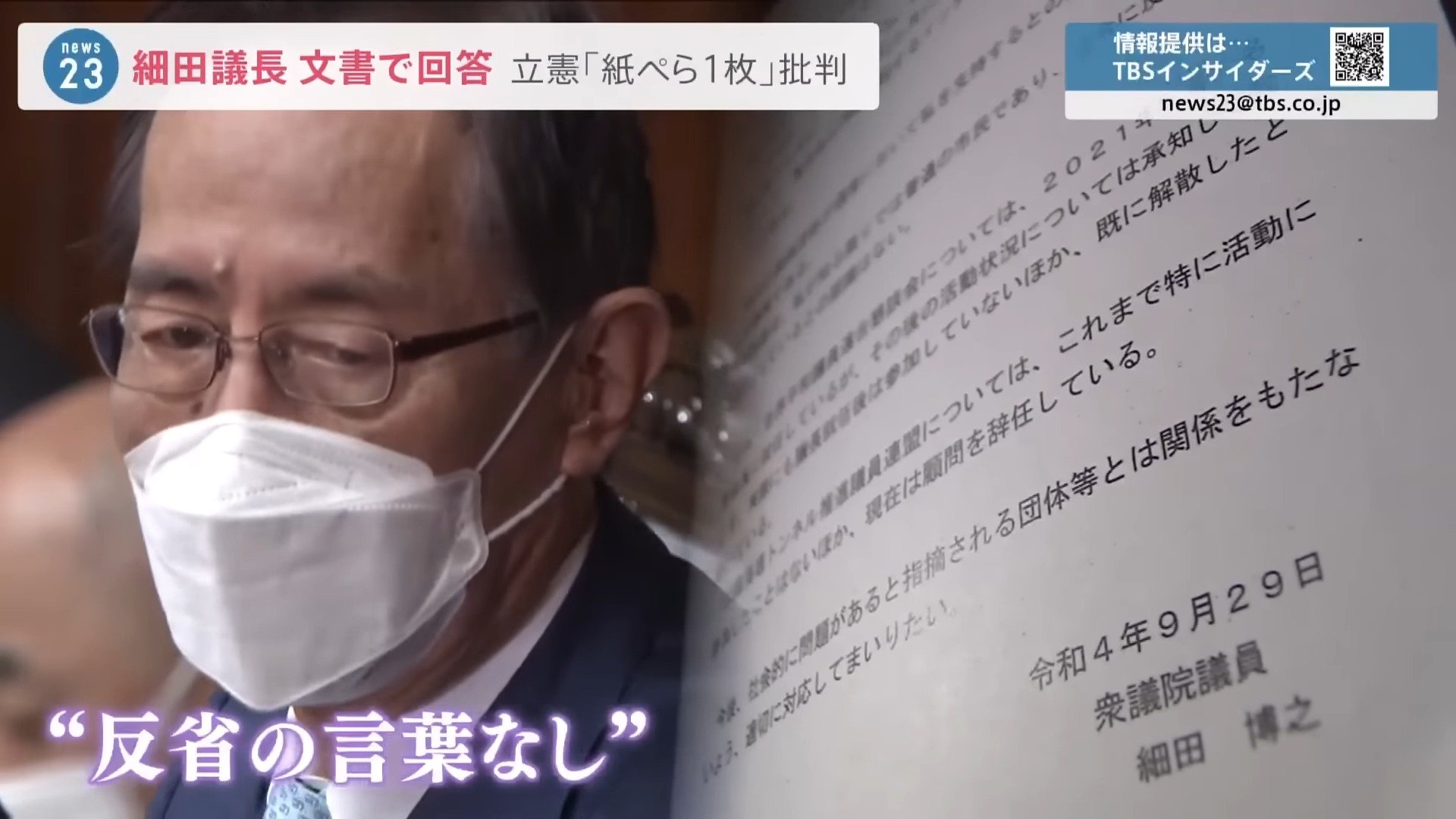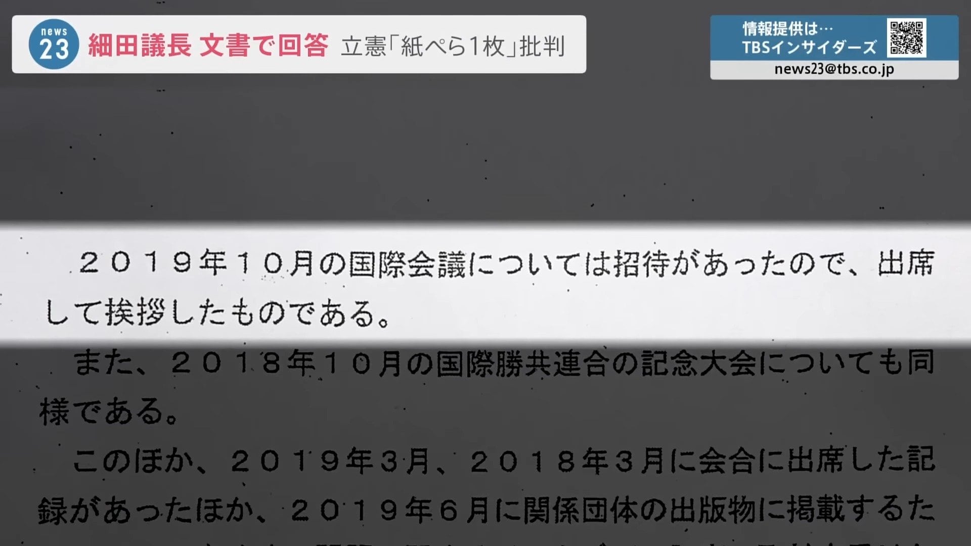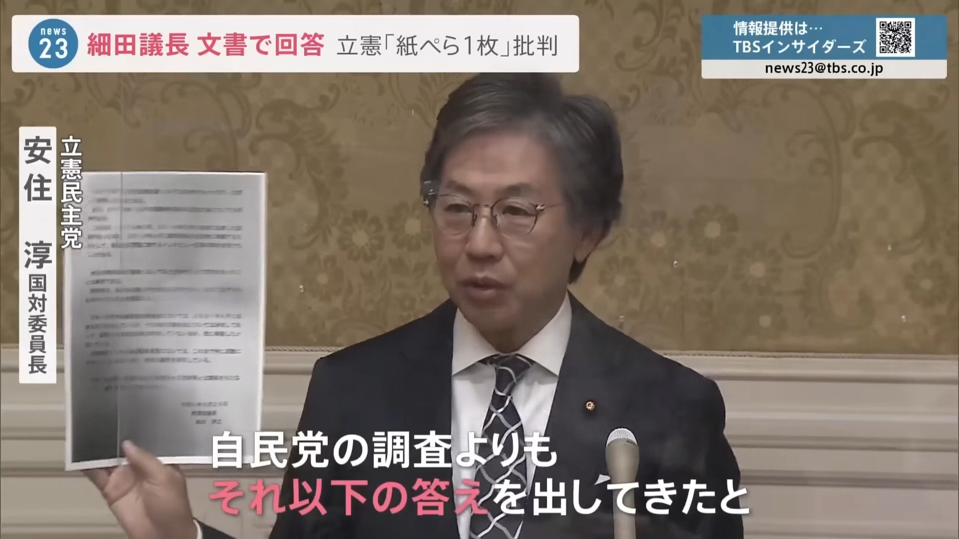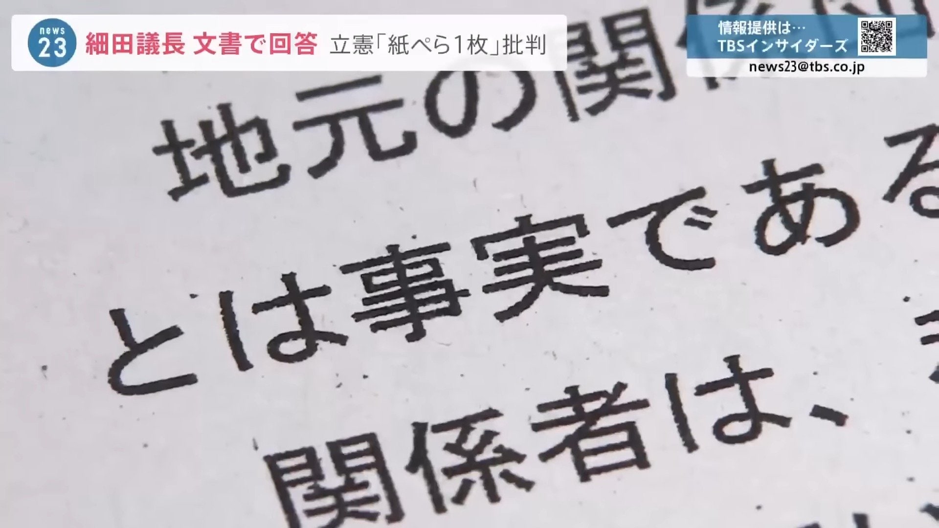 ■「自民党の調査以下」細田議長の”紙ぺら1枚”回答に野党批判