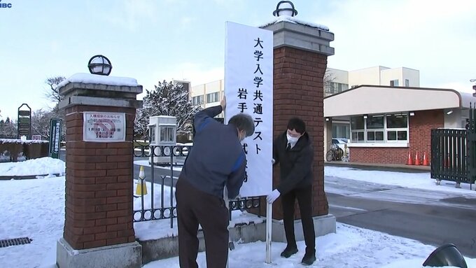大学入学共通テストが18日に始まるのを前に、岩手県内の試験会場のひとつとなっている岩手大学に16日、受験生を案内する看板が設置されました。午前9時半ごろ、盛岡市上田にある岩手大学の正門前では、大学の職員2…
