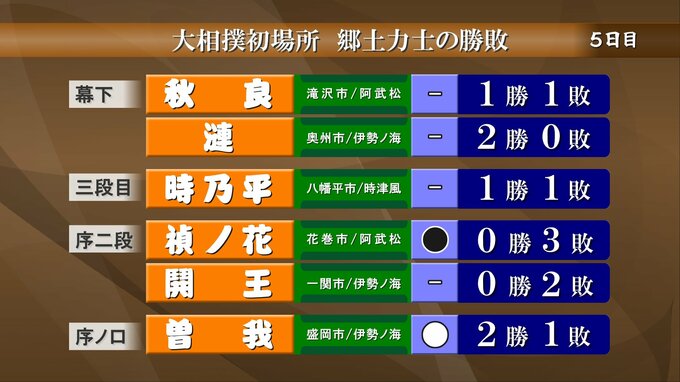 大相撲初場所5日目、郷土力士の取り組みの結果です。