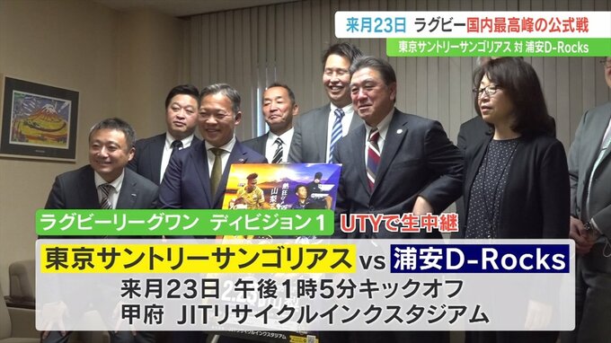 ラグビー・リーグワンの国内最高峰ディビジョンワンの公式戦が2月山梨県内で初めて行われることになり、東京サンゴリアスの関係者が山梨での試合をPRしました。