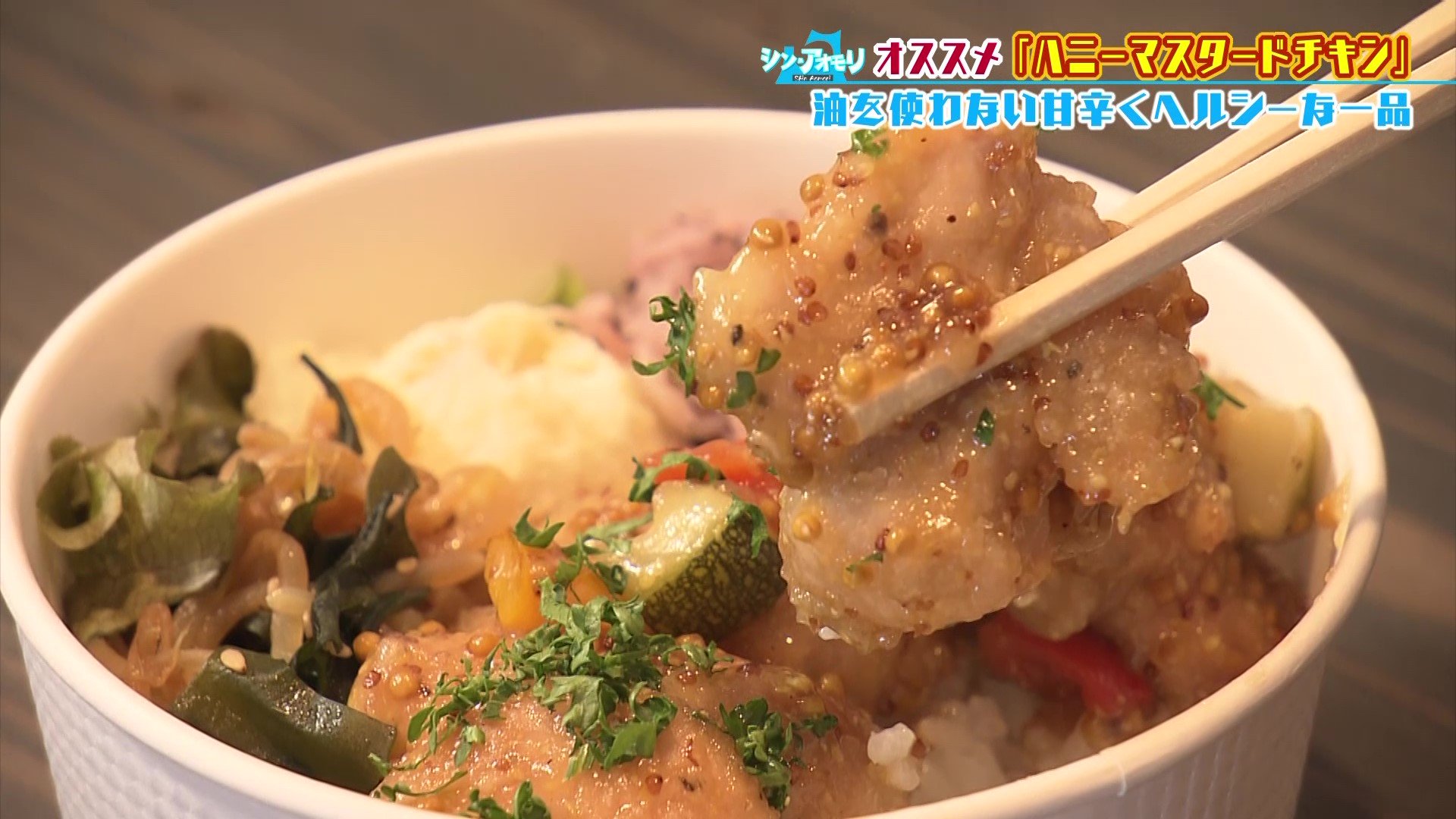 「ハニーマスタード、甘みがあっておいしい。やわらかさがすごい!ぷるぷる、もちもちっていう感じ。この丼1つでチキンもご飯を野菜も全部食べられるのもうれしい。お弁当でこれが出てきたら、ハッピーになれちゃう!スマイルを生み出すお弁当だ!」