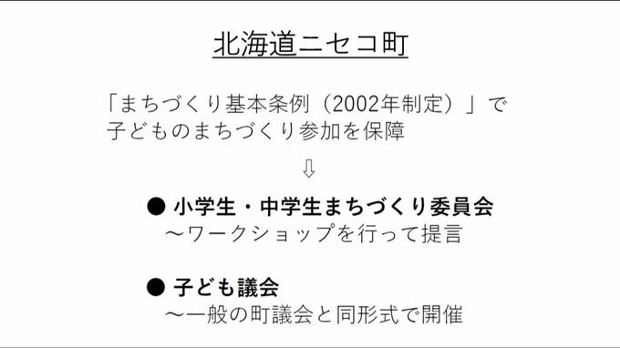 北海道ニセコ町では、2000年に制定された町の基本条例で、満20歳未満の町民がまちづくりに参加する権利を保障し、その権利を実現する手段として「小学生・中学生まちづくり委員会」と「子ども議会」を設置しています。