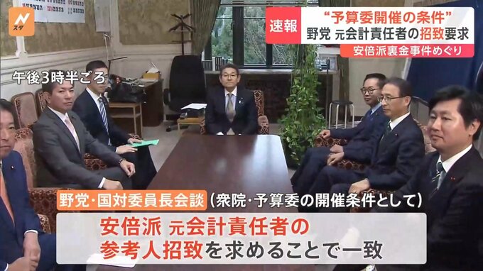 これに先立ち、立憲民主党など野党各党の国対委員長も協議を行い、衆議院の予算委員会を開催する条件として、自民党の派閥の裏金事件の実態解明に向け、予算委員会に安倍派の元会計責任者の参考人招致を求めることで一致しました。