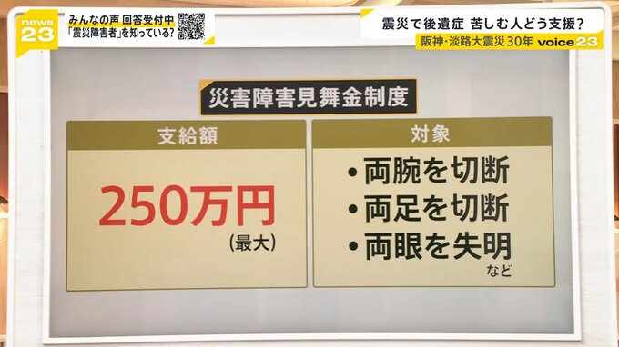 この震災で後遺症のある人について、最大で250万円を支給する「災害障害見舞金制度」が設けられています。対象は、▼両腕を切断した人、▼両足を切断した人、▼両眼を失明した人など、重い障害の人に限られています。