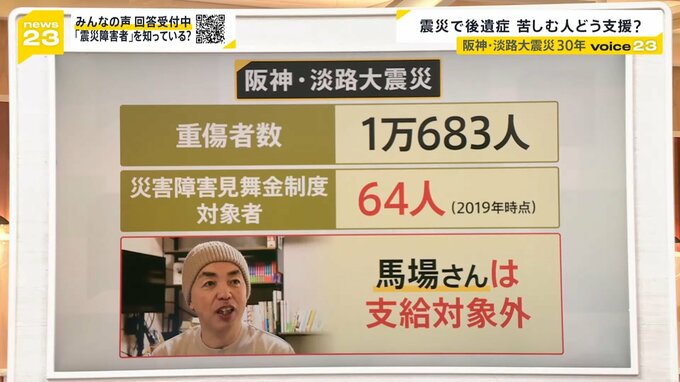 阪神・淡路大震災では、重傷を負った人は1万683人という中で、この制度の対象者は2019年時点で64人となります。馬場覚さんは支給の対象外ということです。