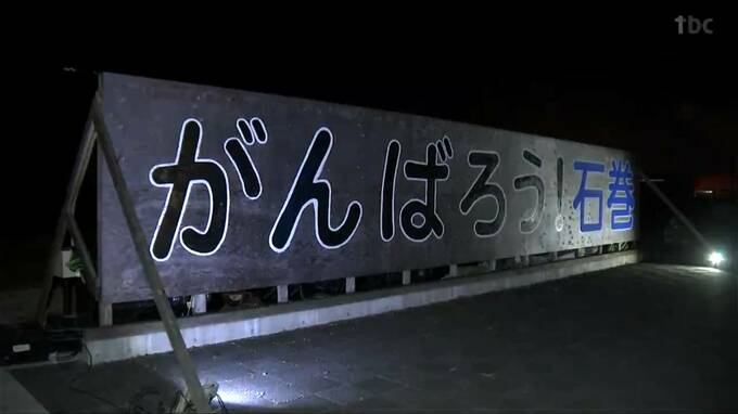 石巻市南浜にある「がんばろう!石巻」の看板前で行われた追悼行事では、LEDキャンドル600個が並べられ、「1・17」の文字が浮かび上がりました。
