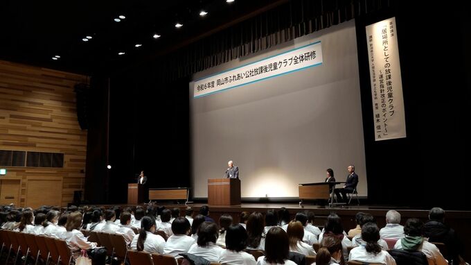 岡山市で開かれた放課後児童クラブの職員を対象とした研修会です。近年利用者が増えていることから、岡山市ふれあい公社が児童支援について学ぶ機会にしてもらいたいと開催したもので、岡山市内の職員約500人が参加しました。