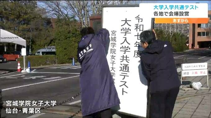 18日から大学入学共通テストが始まります。これを前に、仙台市内の大学でも会場の設営が行われました。試験会場の一つ、仙台市青葉区の宮城学院女子大学でも18日午後、正門前に試験会場の看板が設置されました、ま…