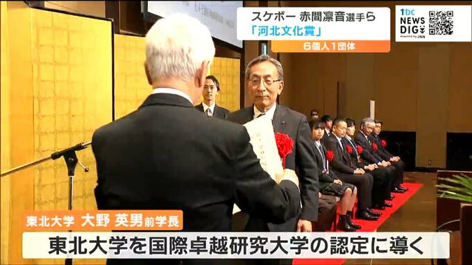 今年度の「河北文化賞」に東北大学の大野英男前学長やスケートボード女子の赤間凛音選手らが選ばれ、賞状などが贈られました。